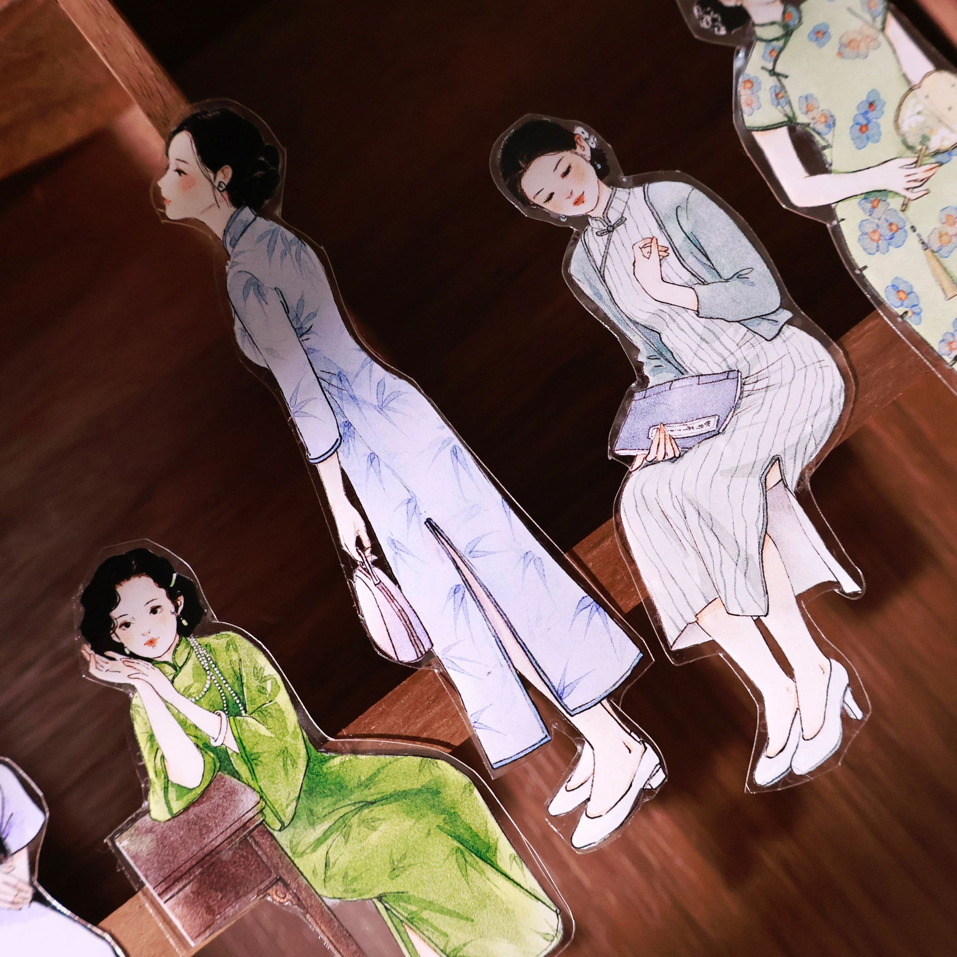 Ancient style cheongsam girl character Retro PET and Washi Paper Tape, the girls in cheongsam, every girl has her own look, confident and beautiful, they all enjoy their daily life, bringing a different feeling to your creations. . Whether you want to liven up a journal, embellish a planner, or add flair to your crafts, these words and patterns will spread joy.