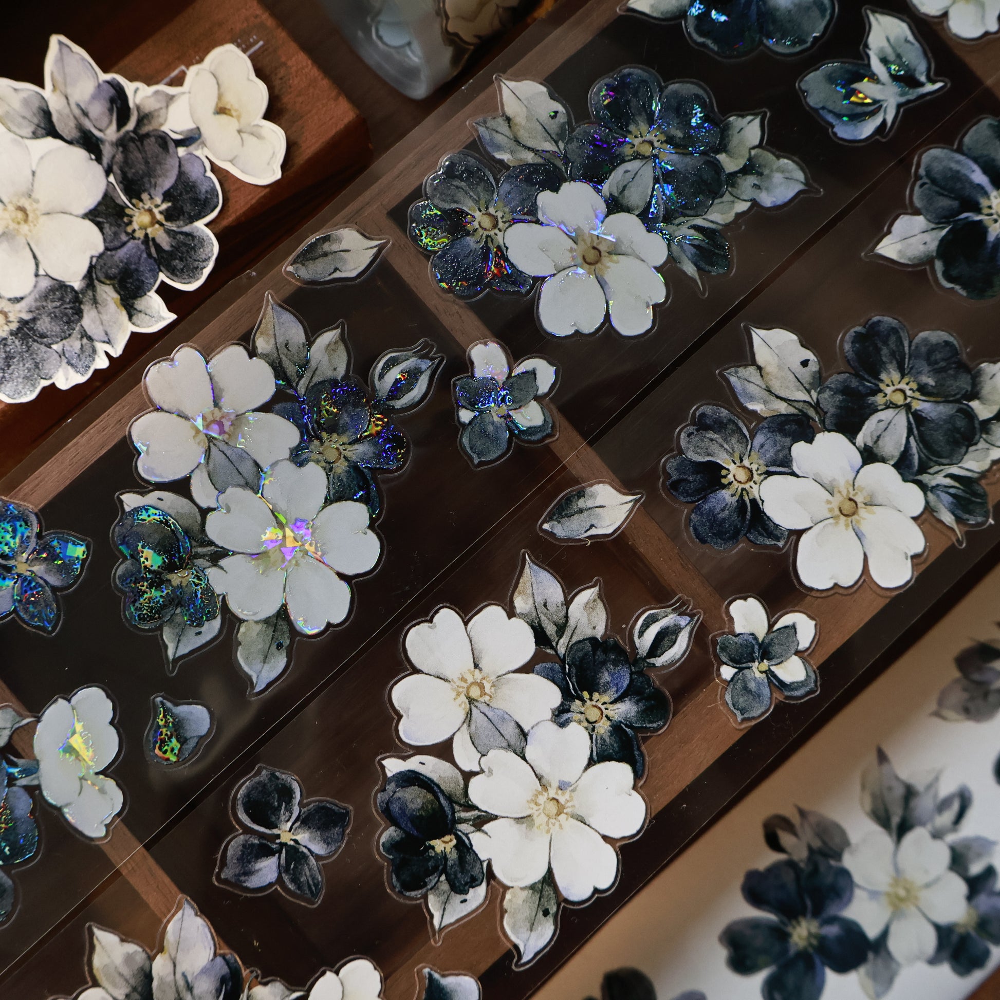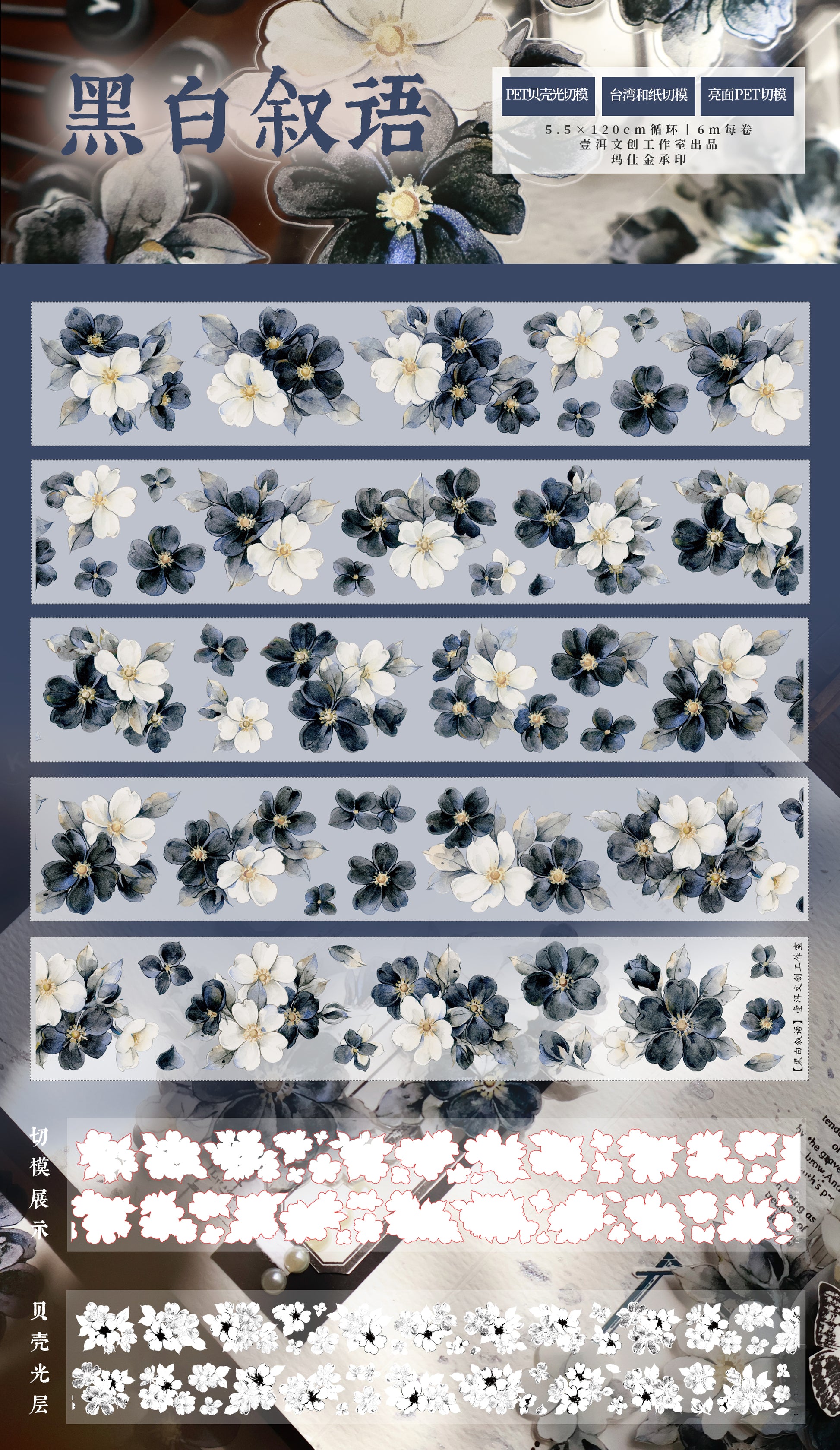 Black and white narrative vintage flower PET and Washi tape, designed with black and white flower as the main element, the color is gentle, romantic and elegant, perfect for adding a touch of sophistication to all your creative projects.