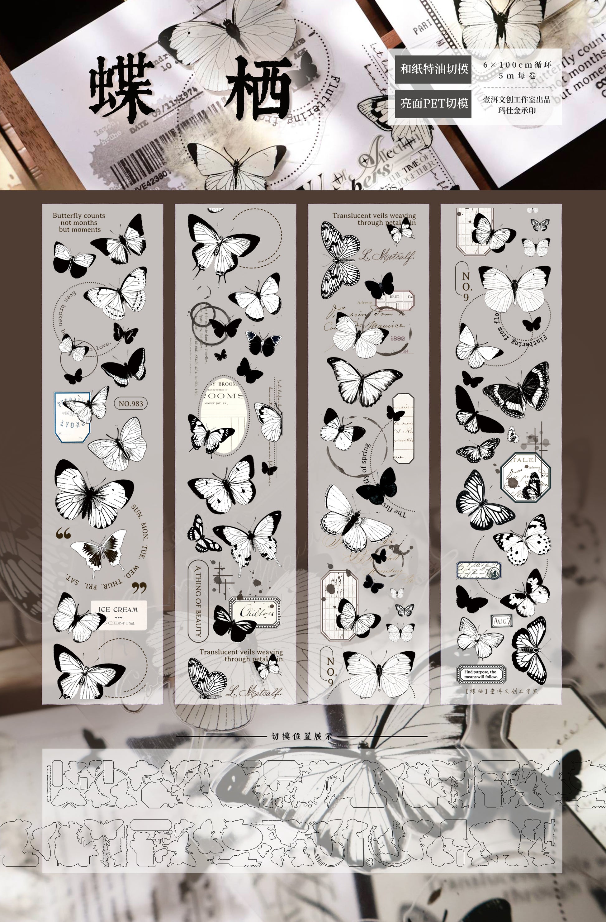 Butterfly habitat vintage black and white butterfly journal PET and Washi tape, designed with black and white butterfly as the main element, the color is gentle, romantic and elegant, perfect for adding a touch of sophistication to all your creative projects.